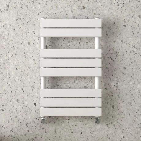 Bring a designer look to your bathroom with the modern matt white Arezzo 840 x 500mm wide heated towel rail, featuring stylish horizontal flat tubes with a straight profile. Manufactured from durable steel with a quality matt white finish, this stylish towel rail provides superb heat output which will gently warm towels and your bathroom or cloakroom.