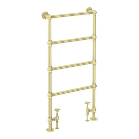 A quality traditional brushed brass floor mounted towel rail with stylish ball joints, it’s classic design would look great in any bathroom. Manufactured to the highest standards and constructed from durable steel. It delivers excellent heat and is ideal for warming towels when in the bath or shower. Supplied with fixings.