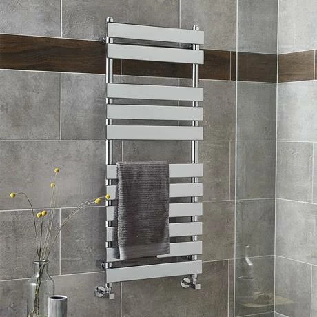The Piazza 11 Bar Heated Towel Rail from Hudson Reed. Handcrafted flat panel designs, featuring a smooth mirrored montage, offer a contemporary design statement. Excellent heat output with an attractive chrome finish.