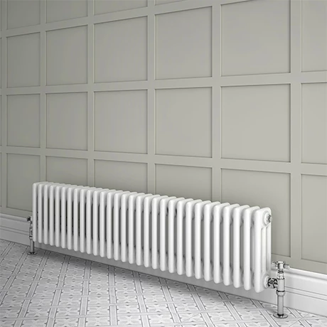 For a cosy, warm bathroom – with loads of room for heating towels, too – opt for this Keswick Cast Iron Style Radiator. At a generous 1355mm wide and boasting impressive power, this low sitting white horizontal radiator works well in larger rooms needing plenty of heat. This traditional column radiator is made from hardwearing steel and will stay looking good thanks to its high quality white gloss finish. Add a pair of radiator valves with classic cross head handles to complete the period inspired look.