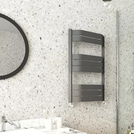 The Milan bow-fronted anthracite designer vertical heated towel rail features an innovative modern design, manufactured from durable steel with a quality anthracite finish, this stylish bow-fronted flat panel towel rail provides superb heat output which will gently warm towels and your bathroom or cloakroom.